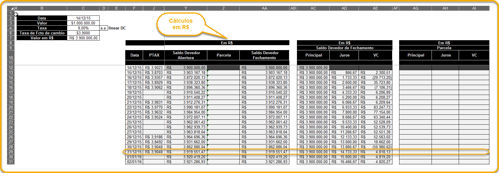 Principal = US$1.000.000,00 x 3,90/US$ = R$3.900.000,00